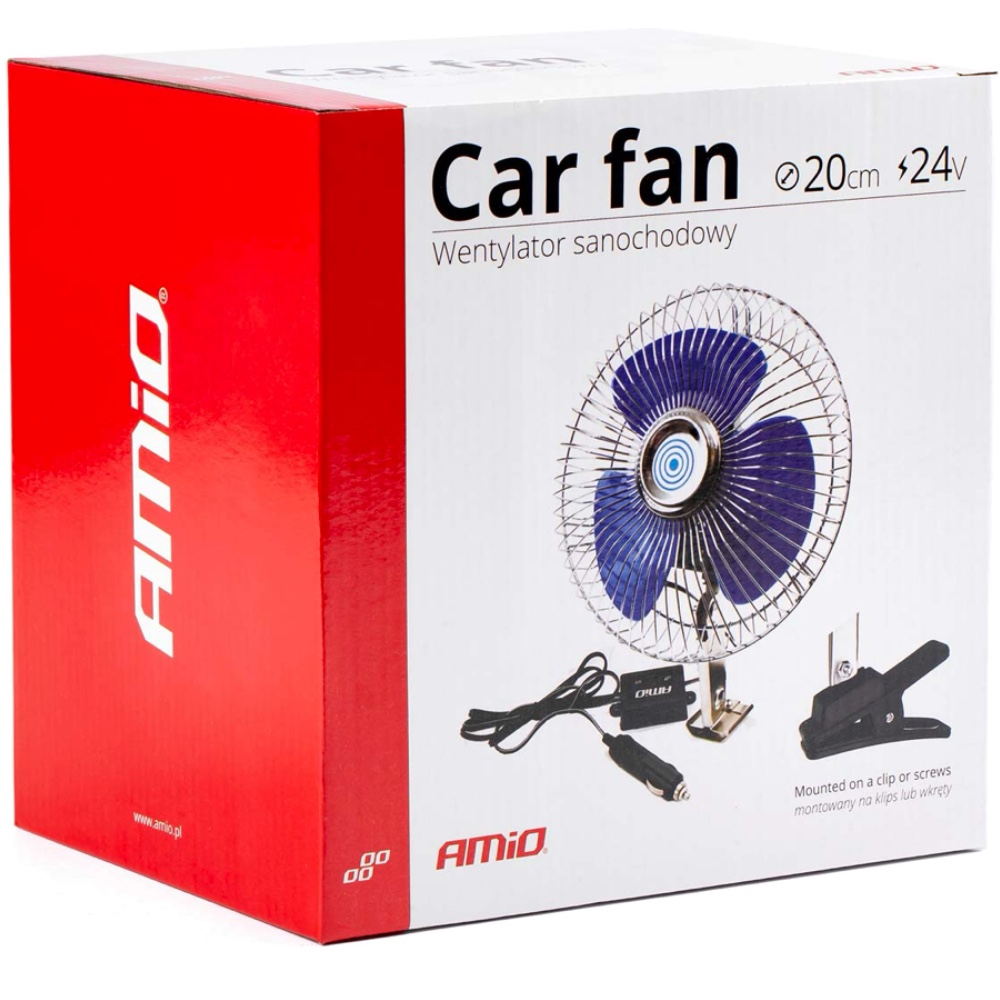Duży metalowy wentylator samochodowy AMiO zasilany z gniazda zapalniczki 24V. Montaż poprzez klips lub śruby.