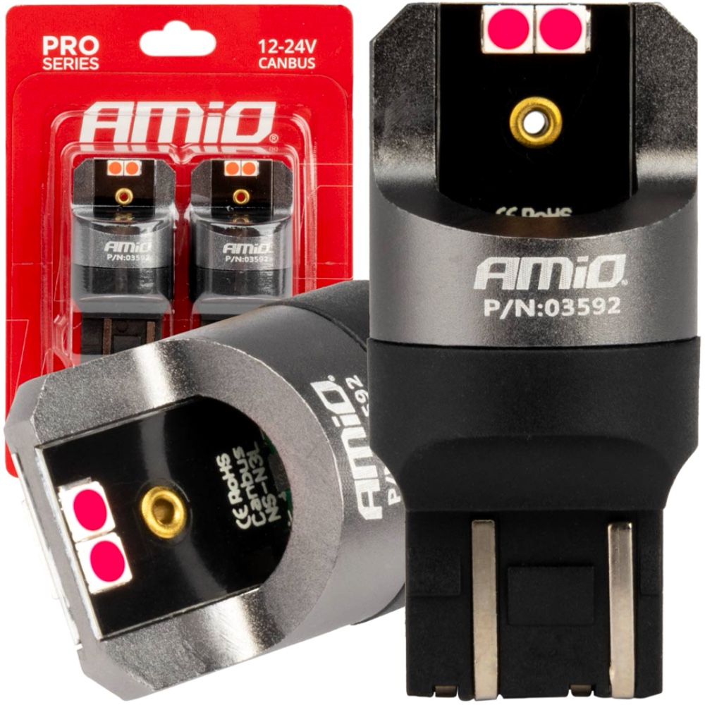 Żarówki samochodowe LED marki AMiO są nowoczesnym rozwiązaniem wykorzystującym technologie diod LED. Użyte diody emitują czerwoną barwę światła oraz są pozbawione efektu mrugania. Wysoka jakość wykonania gwarantuje żywotność żarówek do 50 000 godzin, a specjalny układ zasilania nie wymaga przerabiania instalacji elektrycznej w samochodzie umożliwiając bezproblemowy montaż w tradycyjnych oprawach świetlnych, gdzie wcześniej były wykorzystywane zwykłe żarówki.