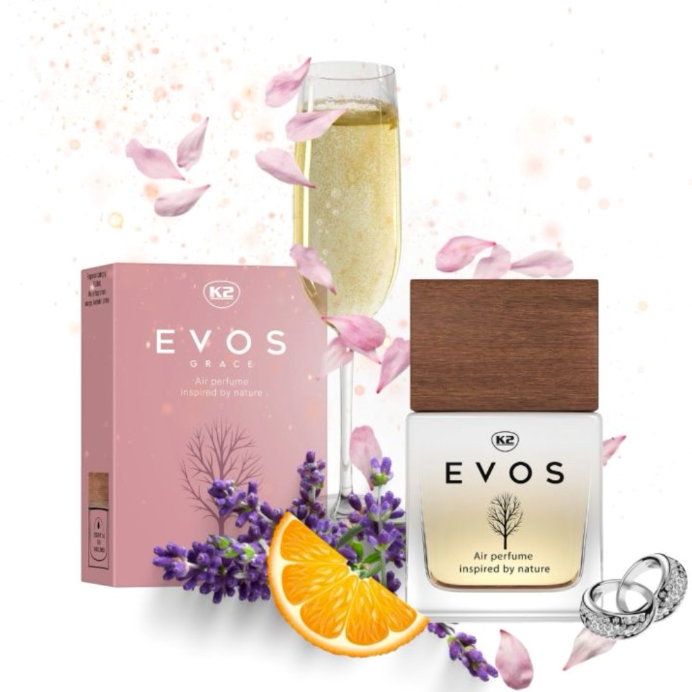 Perfumy do samochodu K2 EVOS GRACE to inspirowana naturą, niezwykła kompozycja wyjątkowych nut zapachowych, zaprojektowana z myślą o wnętrzach nowoczesnych aut.