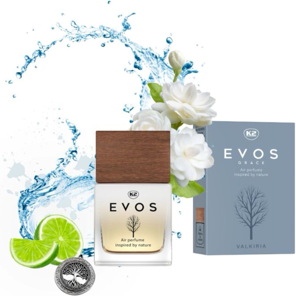 Perfumy do samochodu K2 EVOS GRACE to inspirowana naturą, niezwykła kompozycja wyjątkowych nut zapachowych, zaprojektowana z myślą o wnętrzach nowoczesnych aut.
