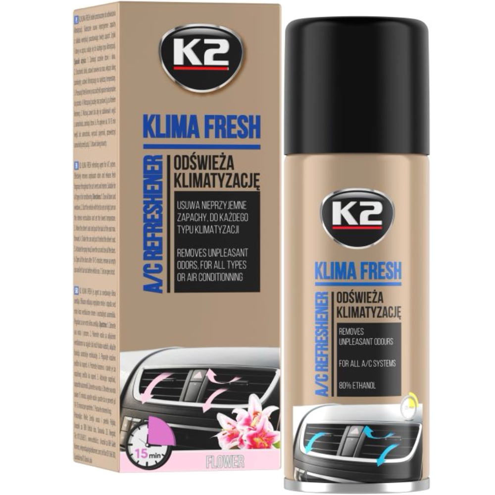 K2 KLIMA FRESH to niezwykle skuteczny i łatwy w użyciu środek do odświeżania klimatyzacji. Usuwa nieprzyjemne zapachy, które powstają na skutek zanieczyszczeń i wilgoci w układzie wentylacyjnym. Cały proces nie zabiera więcej niż kilkanaście minut. Nadaje się do każdego typu klimatyzacji. Po użyciu pozostawia świeży zapach.