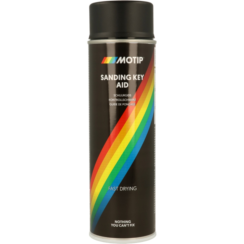 Podczas szlifowania podkładów i szpachli samochodowych możesz zastosować środek MOTIP Sanding Key Aid jako szybkoschnącą warstwę kontrolną. Nałożyć Sanding Key Aid cienką warstwą i pozostawić do wyschnięcia. Po oszlifowaniu zaznaczonej powierzchni, nierówności, takie jak zarysowania i małe otwory (wżery) pozostaną czarne. Następnie można je łatwo usunąć odpowiednią szpachlą MOTIP.