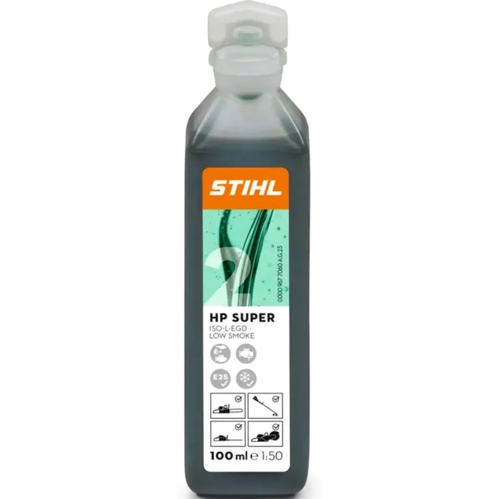 Syntetyczny olej niskodymiący opracowany specjalnie do silników STIHL. HP Super to olej silnikowy o doskonałych właściwościach smarnych, rozruchowych, zapewniający czyste spalanie. Klasa wydajności: JASO-FD, ISO-L-EGD. Proporcje mieszanki 1:50. Buteleczka 100 ml wystarcza na 5L paliwa.