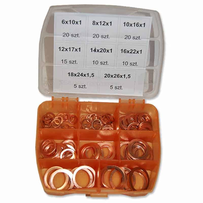 Uszczelki miedziane uniwersalne w plastikowym pudełku – zestaw 105 sztuk: